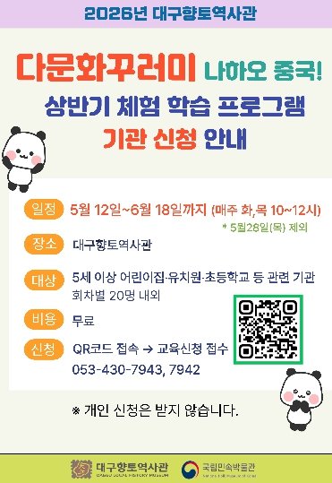 체험은 어린이집·유치원·초등학교(저학년) 단체를 대상으로 매회 20명 정도 모집하여 운영한다. 체험을 희망하는 기관은 4월 15일부터 대구향토역사관 누리집 및 포스터에 나오는 QR코드로 접속해 신청하면 된다.