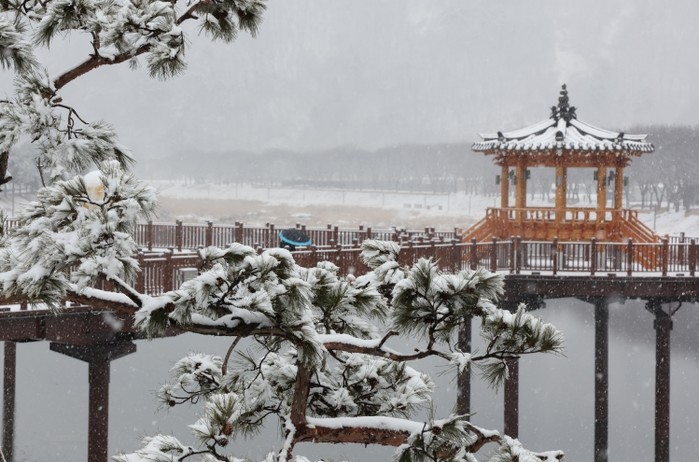 [파이낸셜경제=김기보 기자] 대설주의보가 내린 24일 하얀 눈이 소복이 내려앉은 충북 괴산군 동진천 옆 소나무길이 겨울 정취를 물씬 풍기고 있다.