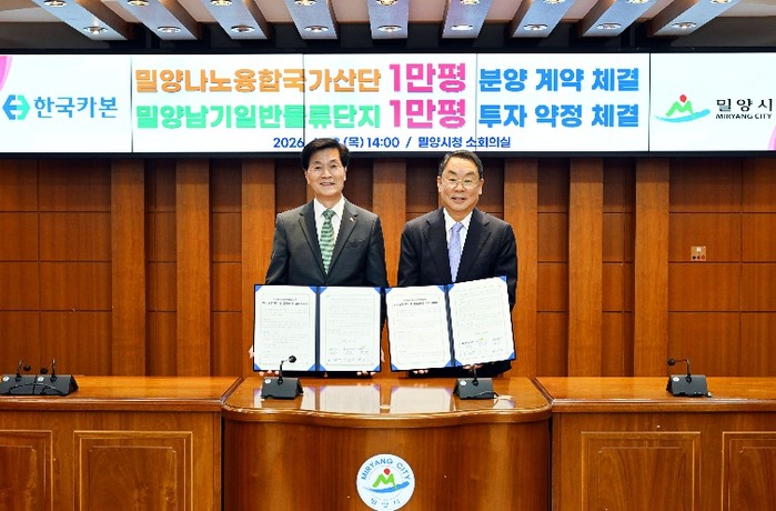 [파이낸셜경제=김예빈 기자] 경남 밀양시는 23일 시청 소회의실에서 ㈜한국카본, 한국토지주택공사 경남지역본부와 함께 ‘밀양나노융합국가산업단지 부지분양 계약 및 밀양남기일반물류단지 투자약정’을 체결했다.