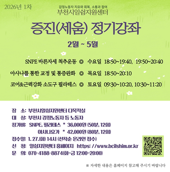 2월부터 5월까지 진행되는 증진강좌는 ▲SNPE(바른 자세 척추 운동) ▲아사나를 통한 교정 및 통증 완화 ▲내 몸을 위한 소도구 필라테스프로그램으로 구성되며, 직무스트레스로 인한 감정노동자의 신체화 증상 완화와 회복에 도움을 줄 것으로 기대된다.