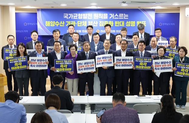 [파이낸셜경제=김예빈 기자] 전라남도의회 농수산위원회 최동익 의원(더불어민주당·여수)은 10월 15일 제394회 임시회 도의회 브리핑룸에서 '국가균형발전 원칙을 거스르는 해양수산 기관·단체 부산 집중화 반대 성명서'를 발표했다.