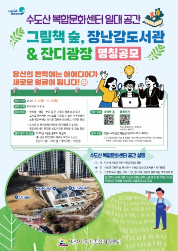 익산시 관계자는 "수도산 복합문화센터 일대 공간은 아이들이 마음껏 뛰어놀고 부모들이 편히 소통할 수 있는 익산시 아동친화 정책의 핵심 거점이 될 것"이라며 "시민들의 애정과 관심이 담긴 이름이 지어질 수 있도록 적극적인 참여를 부탁드린다"고 전했다.