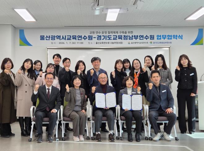 울산교육연수원에서 열린 이날 협약식에는 울산교육연수원 한현숙 원장, 경기도교육청남부연수원 심한수 원장 등 기관 관계자들이 참석했다.