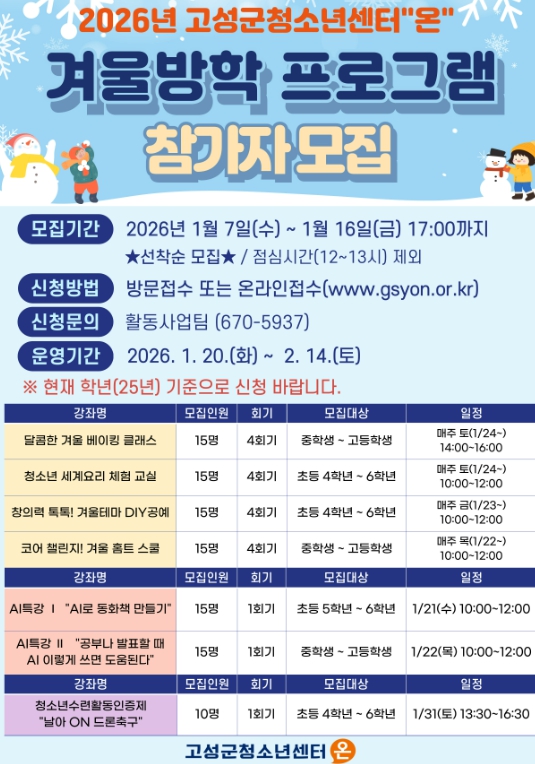 [파이낸셜경제=김예빈 기자] 고성군청소년센터“온”은 겨울방학을 맞이한 관내 청소년들을 대상으로 2026년 1월 20일부터 2월 14일까지 2026년 겨울방학 프로그램 및 특강을 운영한다.
