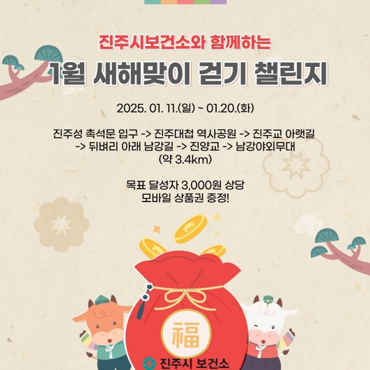 이번 1월의 ‘새해맞이 걷기 챌린지’는 11일부터 오는 20일까지 진행되며, 진주성 촉석문 입구부터 남강 야외무대까지 약 3.4km 구간을 걷는 코스로 운영된다.