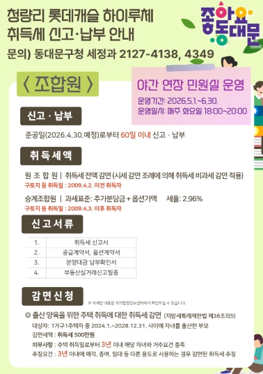 [파이낸셜경제=김예빈 기자] 서울 동대문구는 14일과 15일 양일간, 이달 말 준공 예정인 청량리 제7구역 재개발 아파트 ‘롯데캐슬 하이루체’ 현장에서 신규 입주민을 위한 ‘찾아가는 맞춤형 세무상담’을 성황리에 마무리했다고 16일 밝혔다.