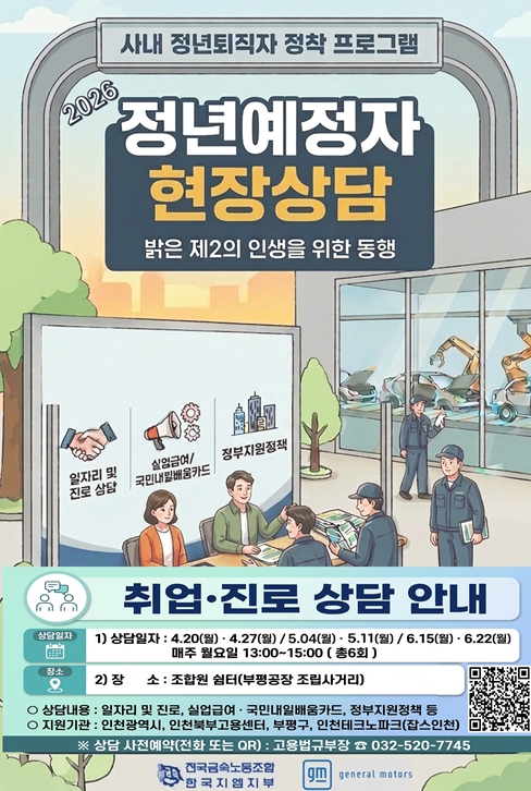 한국지엠 부평공장은 올해 정년에 도달하는 1966년생을 시작으로 오는 2032년까지 약 1,750여 명의 근로자가 순차적으로 퇴직할 예정인 만큼, 체계적인 진로 설계와 재취업 지원이 필요한 상황이다.