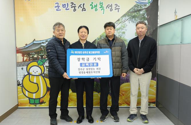 [파이낸셜경제=김지훈 기자] 지난 19일 성주군 쌀전업농회 회원 방경용 · 배점호 · 탁진열씨가 지역인재를 위한 장학금 각 1백만원씩 총3백만원을 (재)성주군별고을장학회에 기탁했다.