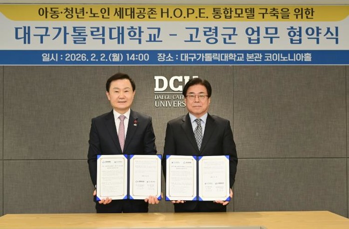 [파이낸셜경제=김지훈 기자] 고령군은 2월 2일 대구가톨릭대학교와 함께 경상북도 지역혁신중심 대학지원체계(RISE)사업의 일환으로'경북 U-Care 맞춤돌봄서비스'추진을 위한 업무협약을 체결했다고 밝혔다.