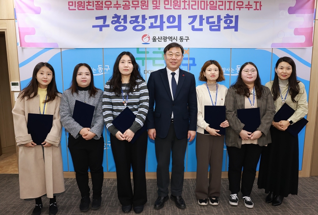 [파이낸셜경제=김예빈 기자] 울산 동구는 12월 24일 오전 9시 구청장실에서 친절 우수 공무원 등 민원 담당 공무원 6명이 참석한 가운데, ‘하반기 친절 우수 공무원 격려’ 및 ‘구청장과 민원 담당 공무원과의 간담회’를 개최했다.