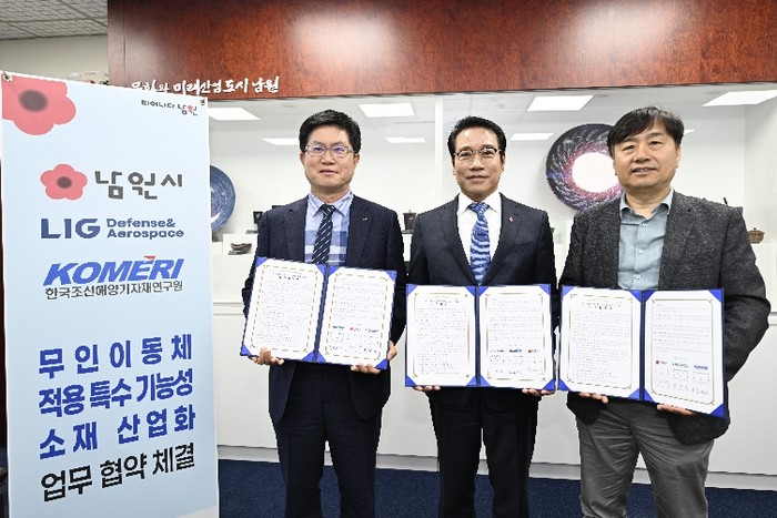 시는 4월 24일 시청에서 LIG디펜스&에어로스페이스, 한국조선해양기자재연구원과 함께 '무인이동체 적용 특수 기능성 소재 산업화' 업무협약을 체결하고, 천연자원 기반 소재의 산업 적용을 위해 공동 협력한다고 밝혔다.