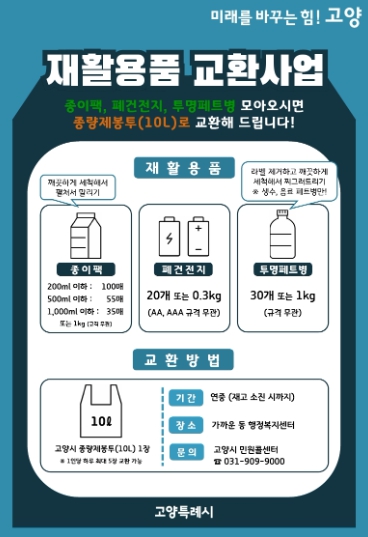 [파이낸셜경제=김기보 기자] 고양특례시가 2회 추가경정예산을 통해 2천만 원을 확보해 시민들의 호응 속에 추진 중인 재활용품 교환사업을 계속 이어간다.
