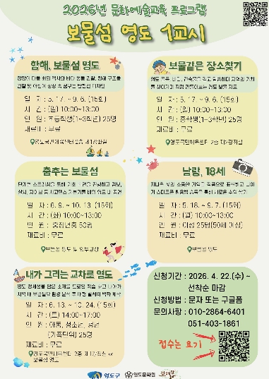 참여신청은 QR코드 또는 문자 접수를 통해 가능하며, 모든 프로그램은 무료로 운영된다. 기타 자세한 사항은 영도문화원 사무국으로 문의하여 확인할 수 있다