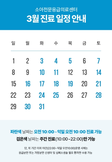 이에 따라 야간진료는 주 3회, 화·수·토요일과 3월 5일, 16일, 19일, 30일에 24시간 이뤄진다.