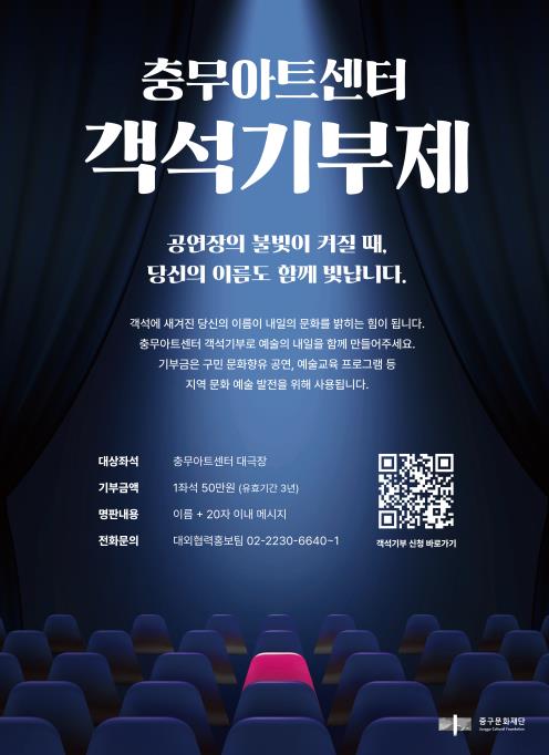 왕소영 중구문화재단 사장은 “하나의 객석이 단순한 좌석을 넘어, 문화예술의 성장에 직접 기여하는 상징적 공간이 되길 바란다”며 “시민 여러분의 참여가 공연장의 불빛처럼 문화의 에너지가 되어 지역 사회에 확산되길 기대한다”고 말했다.