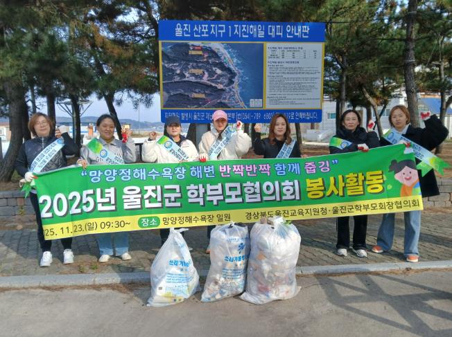 [파이낸셜경제=김지훈 기자] 울진교육지원청은 11월 23일 09시 30분 “먕양해수욕장 해변 반짝반짝 함께 줍깅”이란 슬로건 아래 '2025년 울진군 학부모장협의회 봉사활동'을 실시했다.