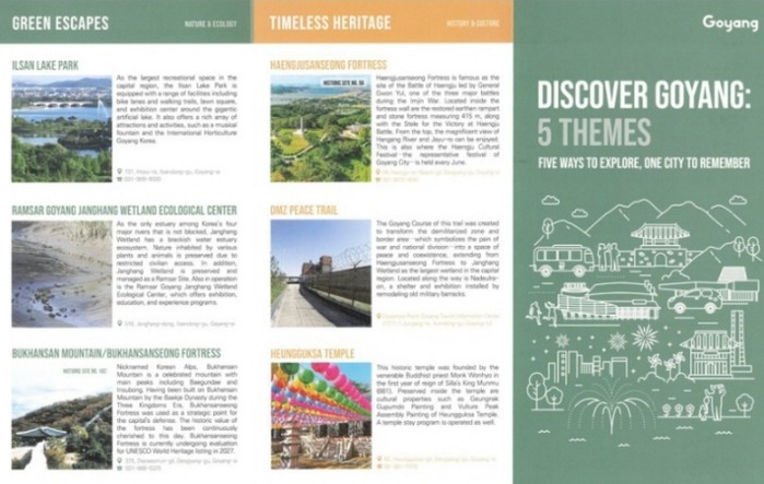 새로 발간된 관광홍보 안내지 제목은 ‘DISCOVER GOYANG: 5 THEMES’ 으로 자연·생태(Green Escapes), 역사·문화(Timeless Heritage) 등 5개의 테마로 분류해 관광지를 소개한다. 특히 방문객의 관심사와 취향에 맞춰 맞춤형 여행코스를 선택할 수 있도록 구성된 것이 특징이다.