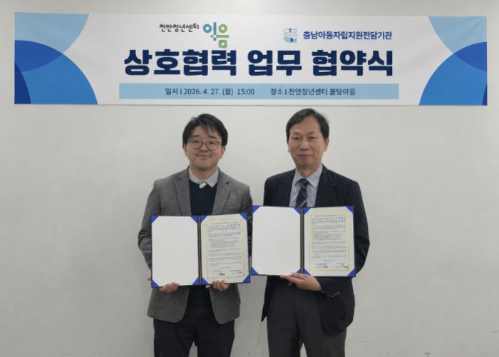 [파이낸셜경제=김영란 기자] 천안시는 천안청년센터 이음이 27일 충남아동자립지원전담기관과 ‘취약계층 청년 발굴 및 통합 지원을 위한 업무협약’을 체결했다고 밝혔다.
