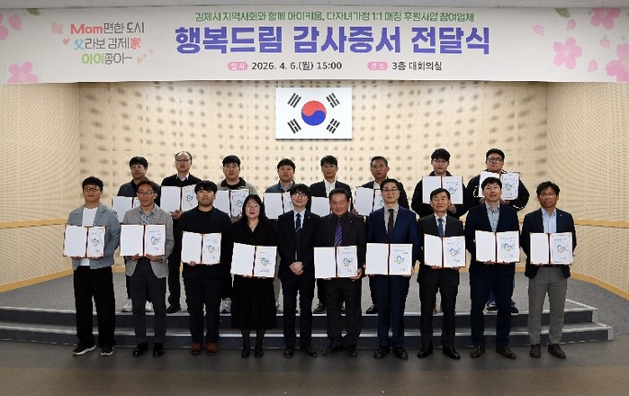 [파이낸셜경제=김예빈 기자] 김제시는 6일 시청 대회의실에서 ‘다자녀가정⇔기업․단체 행복드림 매칭사업’에 참여한 후원업체 대표 및 관계자들을 초청해 감사증서를 전달했다고 밝혔다.