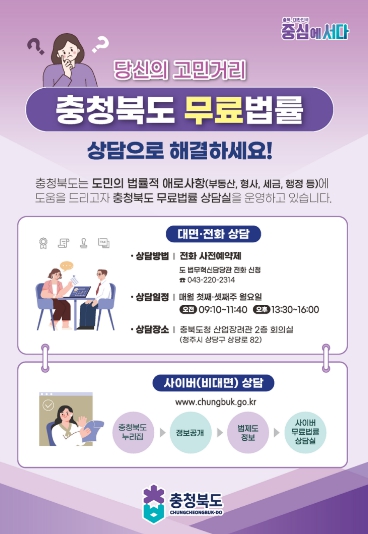 매월 첫째·셋째 주 월요일 충북도청 산업장려관 2층 회의실에서 진행되는 대면·전화 무료법률상담을 받기 위해서는 도 법무혁신담당관을 통해 사전예약을 하면 된다.