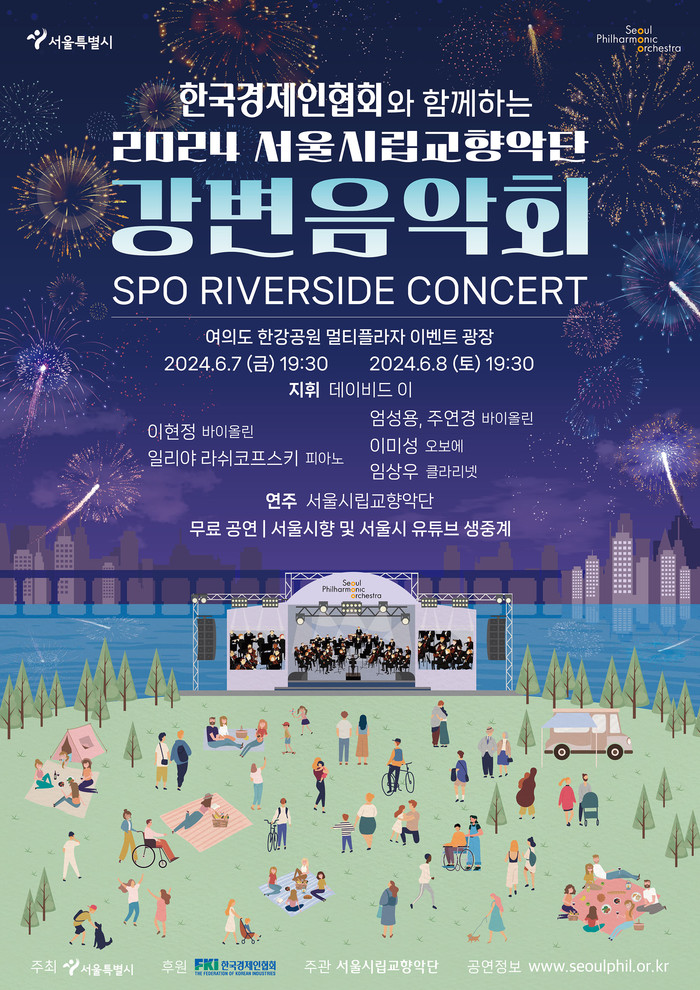‘한국경제인협회와 함께하는 2024 서울시향 강변음악회’는 6월 7일(금)~8일(토) 양일간 저녁 7시30분에 여의도 한강공원 멀티플라자 이벤트 광장에서 개최된다. 객석은 2,000석이 마련되며, 누구나 무료로 사전 신청 없이 관람 가능하다. 정해진 좌석 외에도 행사장 일대에 시민들이 돗자리나 간이의자를 활용해 음악회를 즐길 수 있다는 점도 이번 행사의 장점이다. 한편 공연 마지막에는 한강 배경으로 펼쳐지는 멋진 불꽃놀이가 대미를 장식할 예정이다.