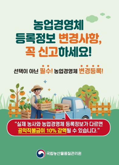 | ▲ 농업경영체 변경등록 미이행 시 직불금 10% 감액 주의! |