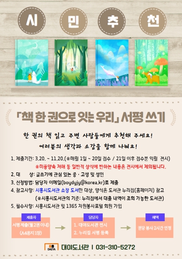 기타 자세한 사항은 시흥시도서관 누리집의 참여마당-도서관 소식 또는 대야도서관에 문의하면 된다.