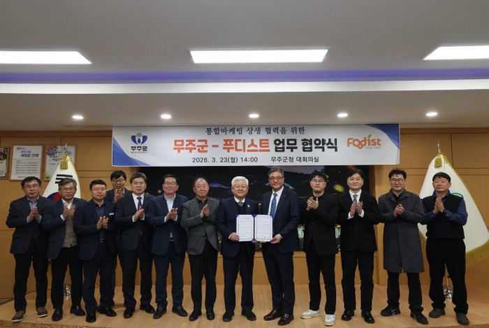 [파이낸셜경제=김예빈 기자] 무주군은 지난 23일 푸디스트(주)와 농산물 통합마케팅 상생협력을 위한 업무협약을 체결했다고 밝혔다. 이날 협약식에는 황인홍 무주군수와 박성하 푸디스트(주) FSBU장을 비롯한 농협 관계자 20여 명이 참석해 의미를 더했다.