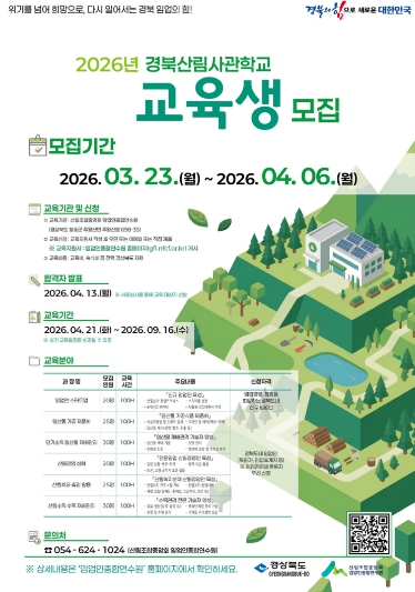 [파이낸셜경제=김지훈 기자] 경상북도는 3월 23일부터 4월 6일까지 15일간 경북 임산업의 경쟁력을 높이고 산촌경제 활성화를 이끌 핵심 인재를 양성하기 위해 ‘2026년 경북산림사관학교 교육생’을 모집한다고 밝혔다.