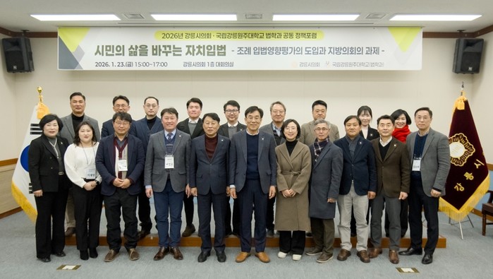 [파이낸셜경제=조성환 기자] 강릉시의회와 국립강릉원주대학교가 시민 중심의 자치입법 실현을 위해 힘을 모았다. 양 기관은 지난 21일 지방 입법정책 발전과 지역공익 법률 지원을 위한 *업무협약(MOU)을 체결한 데 이어, 23일 오후 3시 강릉시의회 대회의실에서 '시민의 삶을 바꾸는 자치입법' 정책포럼을 공동 개최했다.