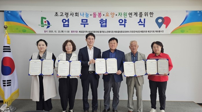 신상균 매포읍장은 “이번 협약은 초고령사회로 접어든 지역 현실에 맞춰 복지 수요 증가에 선제적으로 대응하기 위한 의미 있는 발걸음”이라며 “지역의 다양한 기관과 협력해 민관이 함께하는 복지공동체를 조성하고, 어르신들이 건강하고 행복한 노후를 보낼 수 있도록 최선을 다하겠다”고 말했다.