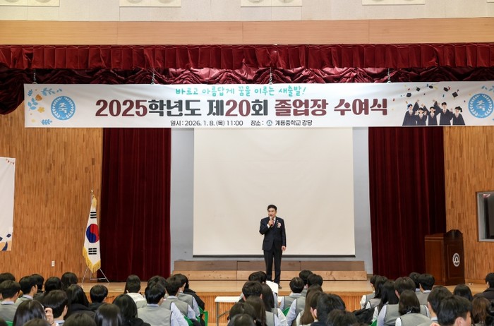 [파이낸셜경제=김영란 기자] 충남 계룡시는 지난 8일 계룡중학교(교장 이기수)에서 개최하는 제20회 졸업식에 참석하여 졸업생들의 새로운 출발을 축하했다.