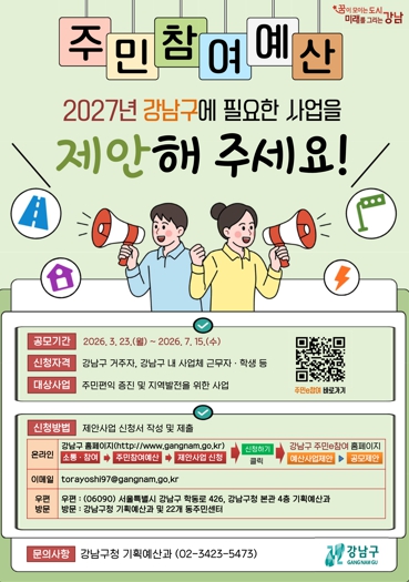 [파이낸셜경제=김예빈 기자] 꿈이 모이는 도시, 미래를 그리는 강남구가 2027년도 예산편성에 반영할 주민참여예산 제안사업 공모를 3월 23일부터 7월 15일까지 진행한다. 올해 공모 규모는 총 13억 원으로, 주민이 직접 생활 속 불편을 해결하고 지역에 필요한 사업을 제안해 예산에 반영하는 참여형 제도다.