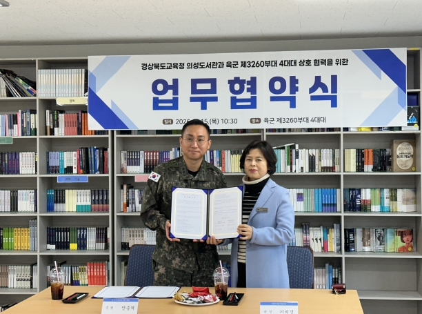 [파이낸셜경제=김지훈 기자] 경상북도교육청 의성도서관은 1월 15일 육군 제3260부대 4대대, 의성군 가족센터와 각각 지역 독서문화 활성화를 위한 업무협약식을 체결했다고 밝혔다.