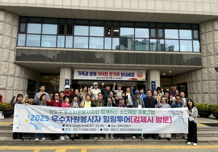[파이낸셜경제=박영진 기자] 영도구자원봉사센터는 지난 9월 24일부터 25일까지 1박 2일간 ‘우수자원봉사자 힐링투어’를 개최하고, 우수 자원봉사자 30여 명과 함께 영도구의 우호도시인 전북 김제시를 방문했다.