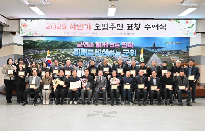 [파이낸셜경제=김지훈 기자] 군위군은 30일 오전 10시 군청 대회의실에서 수상자와 가족, 부서장 등 50여 명이 참석한 가운데 2025년도 하반기 모범 주민에 대한 표창 수여식을 개최했다.