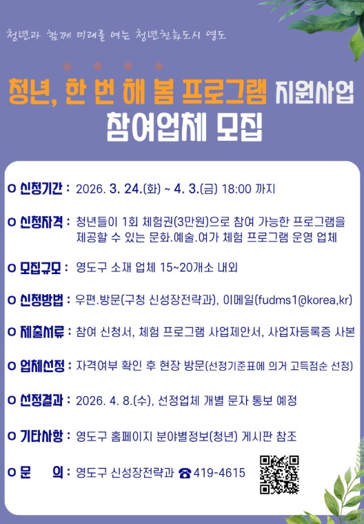 [파이낸셜경제=박영진 기자] 부산 영도구는 청년들에게 다채로운 문화 향유의 기회를 제공하고 지역 청년 문화를 활성화하기 위해 '2026년 청년, 한 번 해 봄 프로그램 지원 사업'을 추진한다고 밝혔다.