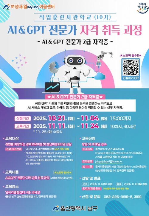 [파이낸셜경제=김예빈 기자] 울산 남구 ‘여성내:일(My-Job)이음센터’는 급변하는 4차 산업혁명과 디지털 전환 가속화에 따라 여성의 전문 직무 역량 강화를 위한 프로그램으로 ‘AI · GPT 전문가 자격 2급 취득 과정’을 오는 11월 11일부터 24일까지 운영한다고 밝혔다.