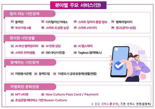 주요 서비스로는 ▲개인별 맞춤형 혜택을 알려주는 ‘인공지능(AI) 부산행복알리미’ ▲생성형 인공지능(AI) 기반의 ‘인공지능(AI)민원상담’ ▲개인 건강관리 ‘인공지능(AI) 헬스케어’ ▲‘스마트 일자리 통합 정보’ ▲‘스마트 반려생활’ ▲‘부산사랑e몰’ 등 디지털 지갑 기능을 포함한 20여 개 서비스를 하나의 앱에서 제공한다.