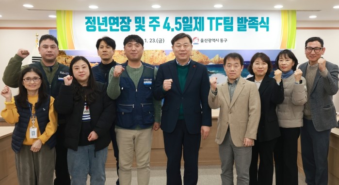[파이낸셜경제=김예빈 기자] 울산 동구는 1월 23일 오후 4시 동구청 상황실에서 구청장을 비롯해 자치단체공무직본부 동구지회장, 조합원 등 기관 및 노조 관계자 10명이 참석한 가운데 ‘정년연장 및 주 4.5일제 논의를 위한 TF팀 발족식’을 개최했다.