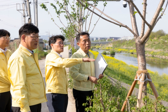| ▲ 윤성진 화성특례시장 권한대행이 황구지천 일대를 점검하며 하천 범람 대비 상황을 살피고 있다 |