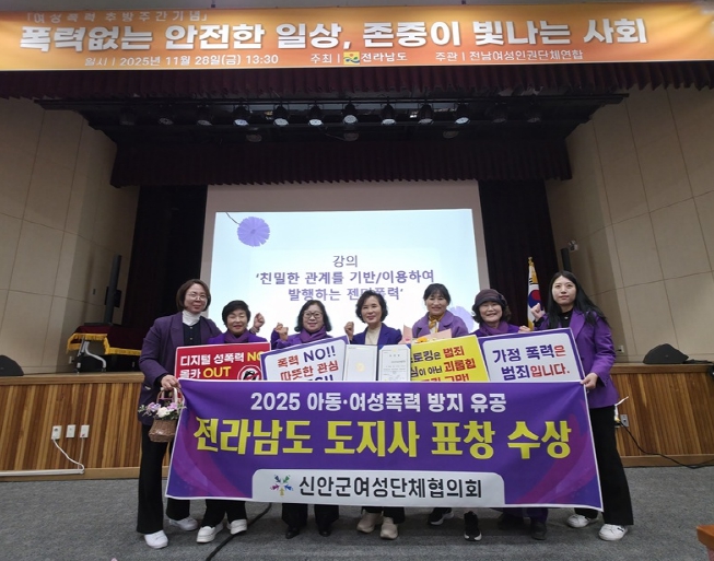 [파이낸셜경제=김예빈 기자] 신안군여성단체협의회(회장 안미영)가 11월 28일 전남여성가족재단에서 개최된 ‘2025년 여성폭력추방주간 기념행사’에서 여성폭력 방지 유공을 인정받아 전남도지사 표창을 수상하는 영예를 안았다.