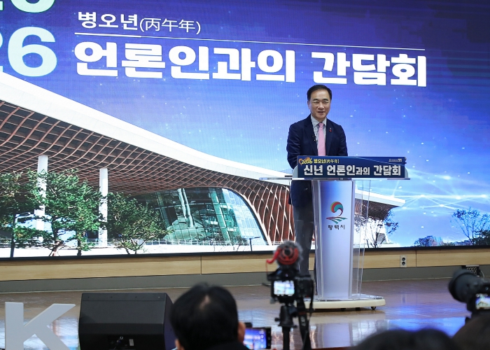 [파이낸셜경제=김기보 기자] 평택시가 2026년 병오년을 맞아 신년 언론인 간담회를 19일 열어 새해 주요 시정 방향을 밝혔다. 이번 간담회에는 100여 명의 언론인과 정장선 평택시장을 비롯한 간부 공무원이 참석했으며, 주요성과 발표, 2026년 주요 시책 설명, 질의응답 순으로 진행됐다.