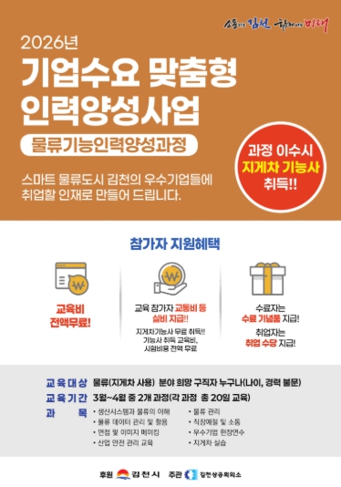 이번 과정은 스마트 물류도시로 거듭나고 있는 김천시의 산업 구조 변화에 대응하고, 물류 일자리에 맞춤형 인력 양성과 취업연계를 통해 산업 경쟁력을 제고하기 위해 매회 15명씩 총 30명의 교육생을 모집해 진행될 계획이다.