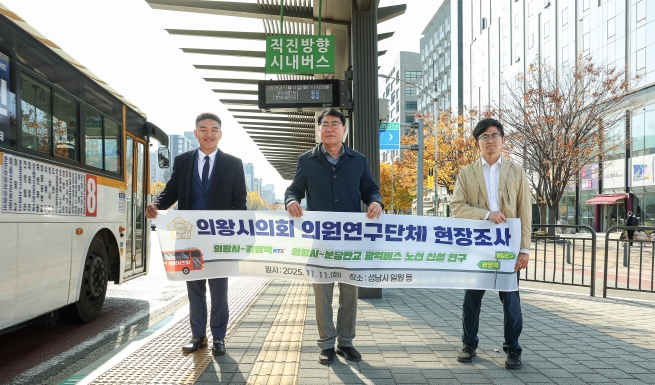 [파이낸셜경제=김기보 기자] 의왕시의회 의원연구단체‘의왕시에서 광명역과 분당·판교로 가는 광역버스 노선 신설 추진 방안을 연구하는 의원 모임’ 소속 한채훈 대표의원과 서창수, 박현호 의원 등은 11일, 신규 광역버스 노선 도입의 당위성과 효율성을 확보하기 위해 성남시 일원에서 현장 조사를 진행했다.