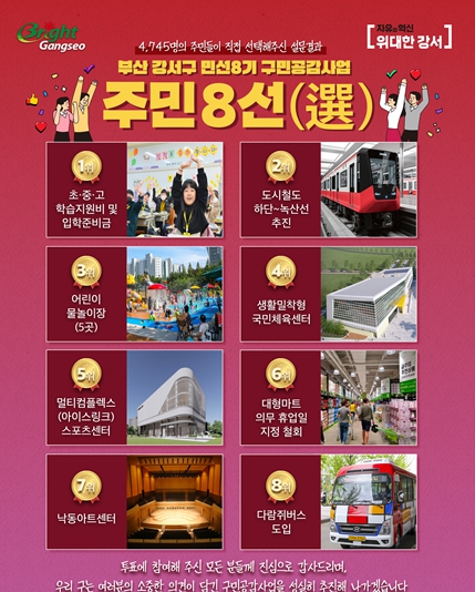 [파이낸셜경제=박영진 기자] 부산 강서구는 민선8기 3년간 추진한 주요 사업 가운데 주민이 직접 선정한 ‘주민 8선(選)’을 발표했다. 이번 조사는 지난 8월 14일부터 9월 13일까지 구 홈페이지(PC 또는 모바일)를 통한 온라인 설문 방식으로 진행됐으며, 총 4,745명이 참여해 큰 관심을 모았다.