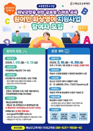 [파이낸셜경제=김예빈 기자] 여수시가 운영하는 5개 공립 작은도서관에서 오는 2026년 1월 5일부터 8일까지 ‘겨울방학 독서문화 프로그램’ 수강생 106명을 선착순 모집한다.이번 프로그램은 방학을 맞아 학생과 성인을 대상으로 독서를 통해 창의력·사고력을 증진하기 위한 ...